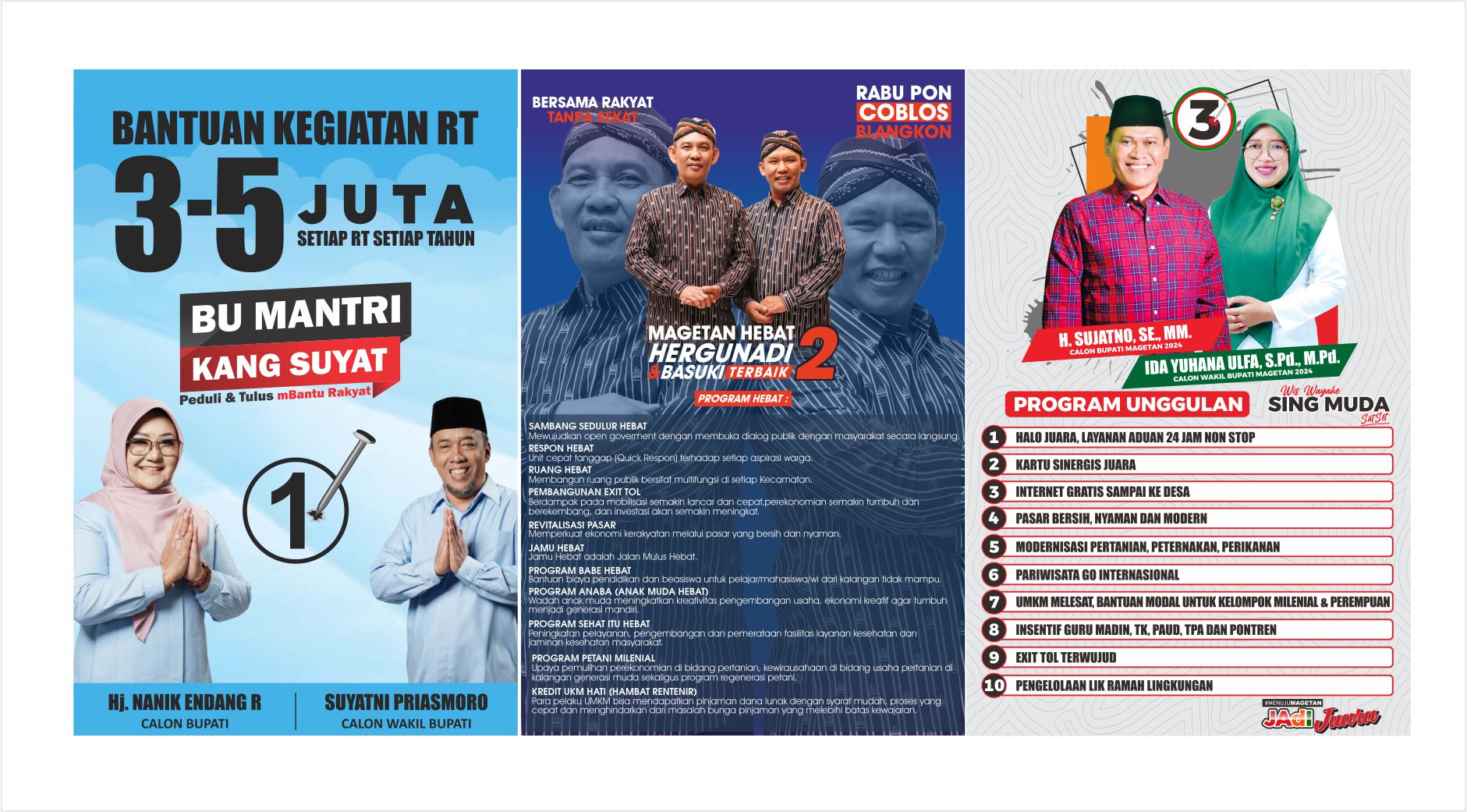 Sebagai informasi, pada Pemilihan Bupati dan Wakil Bupati Magetan tahun 2024 mendatang, terdapat tiga kontestan yang akan bertarung dalam pesta demokrasi, diantaranya Paslon dengan tagline “Niat” (Nanik Sumantri-Suyatni Priasmoto), “Hebat” (Hergunadi-Basuki Babussalam), dan juga “Jadi Juara” (Sujatno-Ida Yuhana Ulfa).