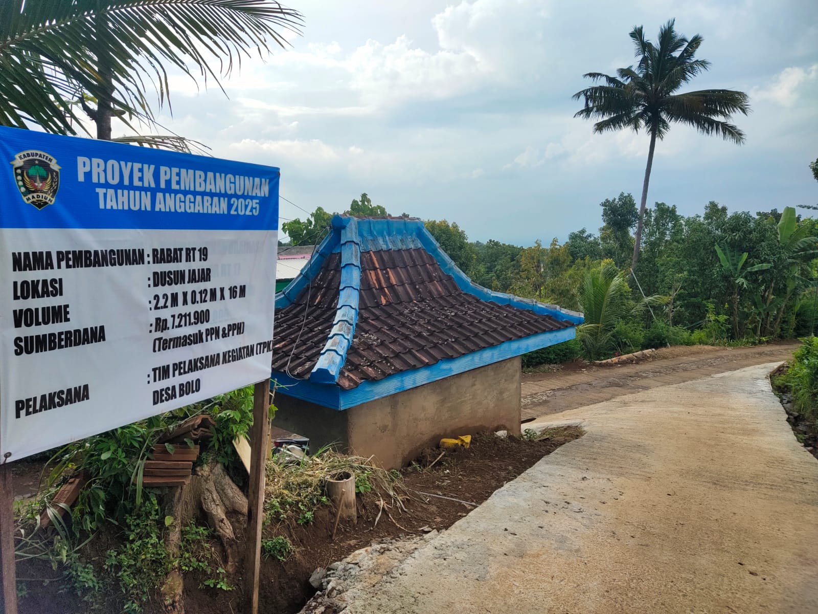 Proyek pembangunan jalan rabat beton di Dusun Jajar RT 19 RW 06 ini, dengan volume 2,2 x 0,12 x 16 meter.