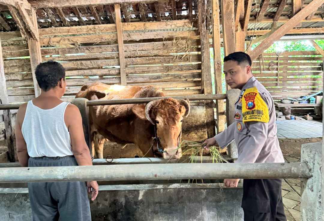Bhabinkamtibmas Desa Lengkong, Brigpol Lintang S.M., dalam kegiatan ini melakukan pengecekan terhadap ternak sapi milik Bapak Harsanto.