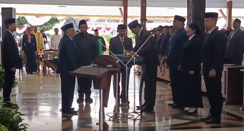 Rijanto menutup sambutan dengan pantun yang mengajak seluruh birokrasi bersemangat mengabdi. “Hari ini bersejarah bagi saudara semua, diambil sumpah di hadapan Yang Kuasa.