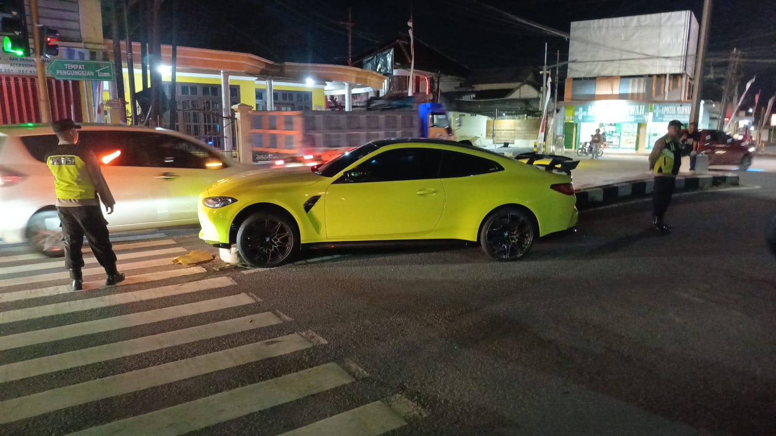 Saat pemantauan di lokasi kejadian, mobil BMW warna kuning itu sudah dalam kondisi tidak terpasang plat nomor kendaraan dan posisi mobil menancap di pembatas jalan bagian tengah.