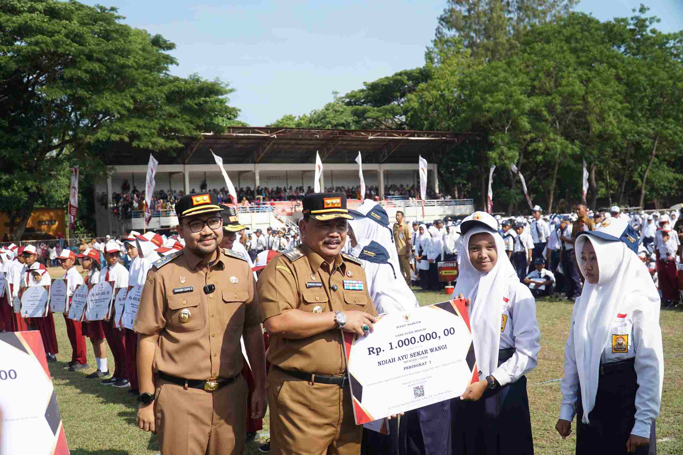 “Jangan dilihat besar rupiahnya, tapi perhatian pemerintah terhadap prestasi anak-anak. Hari ini kita kumpulkan anak-anak, orang tua, dan guru dalam satu stadion, memberi motivasi agar terus belajar, berjuang, dan meraih cita-cita. Pemerintah ingin lahir generasi tangguh yang kelak bisa menjadi pemimpin bangsa dari Kabupaten Nganjuk,” ujar Kang Marhaen sapaan akrab Bupati Nganjuk, Marhaen Djumadi.