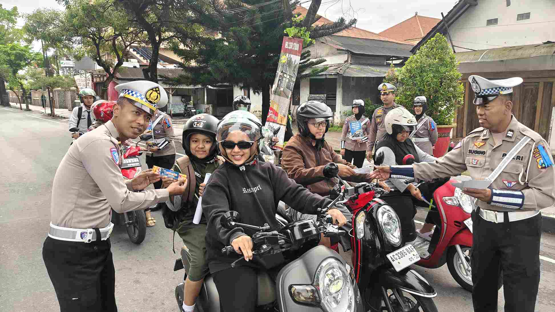 Dalam aksinya, anggota Satlantas tampak menyapa para pengendara, terutama yang sudah tertib dan melengkapi surat-surat kendaraan serta helm standar.
