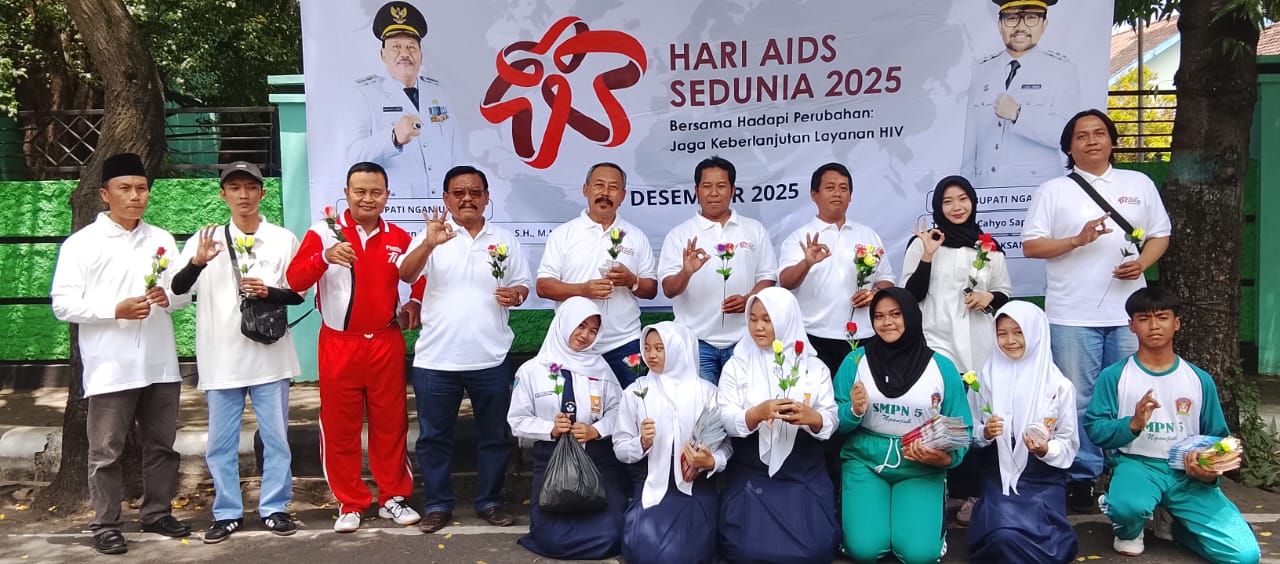 Aksi yang digelar di sepanjang Jalan Yos Sudarso, Nganjuk tepatnya di depan SMP Negeri 5 Nganjuk, Senin (1/12/2025) ini, menandai peringatan hari AIDS sedunia tahun 2025.