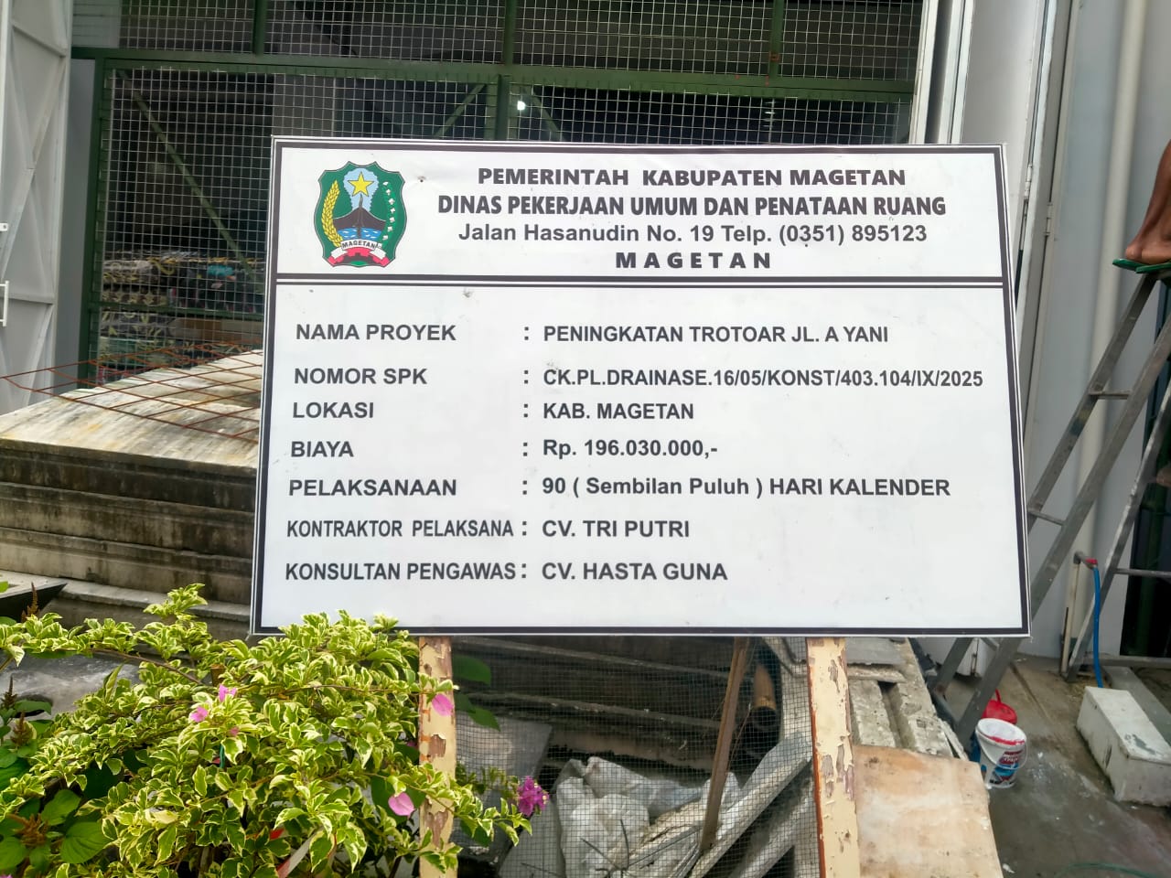 Lokasi pembangunan di Jalan A Yani Kelurahan Kepolorejo Kabupaten Magetan. Yang dikerjakan oleh CV. Tri Putri dan Pengawas pelaksana CV. Hasta Guna. Dengan Nomor Kontrak CK.PL.DRAINASE.16/05/KONST/403.104/IX/2025.