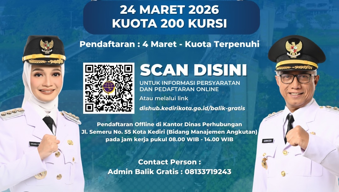 “Tahun 2026 ini, Program Balik Gratis Kota Kediri kembali hadir untuk masyarakat Kota Kediri. Dinas Perhubungan menyiapkan kuota 200 kursi untuk keberangkatan pada 24 Maret 2026 mendatang,” terang Kepala Dinas Perhubungan Kota Kediri, Arief Cholisudin.